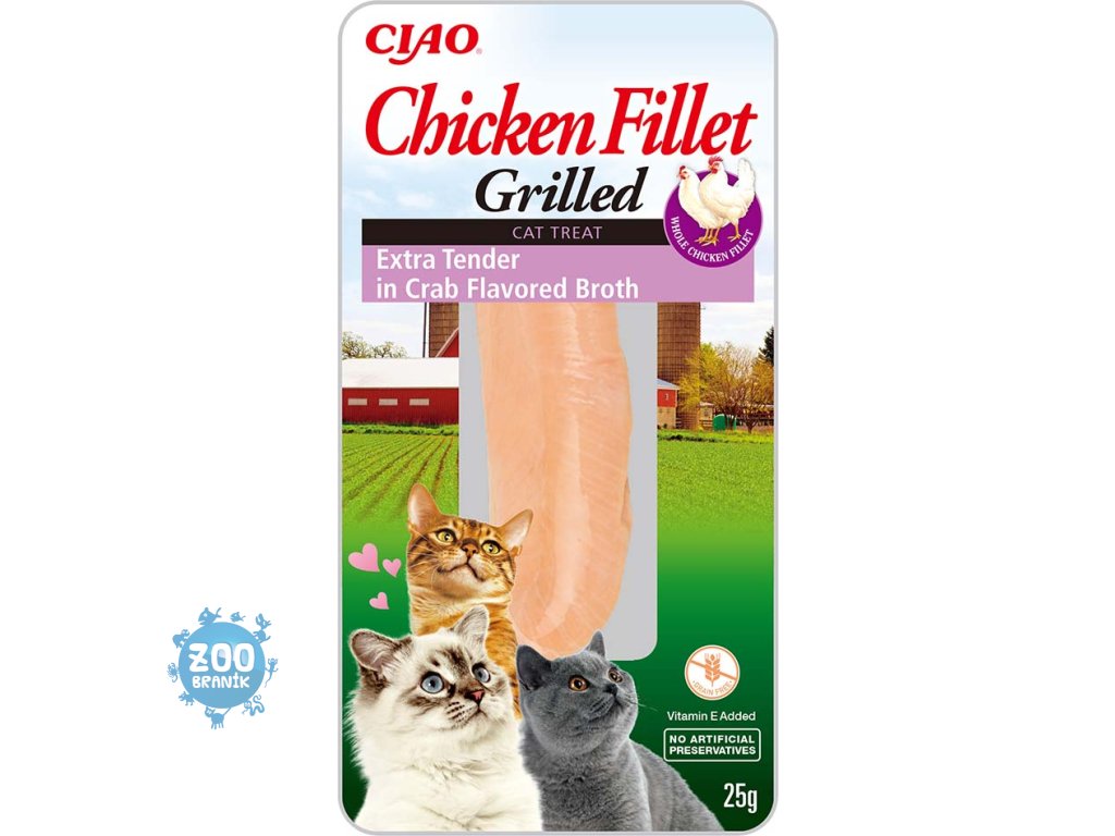 100% extra křehké kuřecí filátko v poctivém krabím vývaru. Šťavnatý grilovaný filet z farmářského kuřete pro gurmánský zážitek. Neodolatelná chuť a vůně poctivého masa. Křehké filátko potěší vaší kočičku jako pamlsek nebo jako doplněk běžné krmné dávky. Lahodný vývar skvěle ochutí jakékoliv granule a pomůže zvýšit chuť k jídlu. Nízký obsah kalorií. Bez obilovin, bez obsahu umělých barviv, bez chemických dochucovadel a bez aromat. Kočičí grain free pochoutka Chicken Fillet je navíc obohacena o 100% přírodní extrakt ze zeleného čaje.
