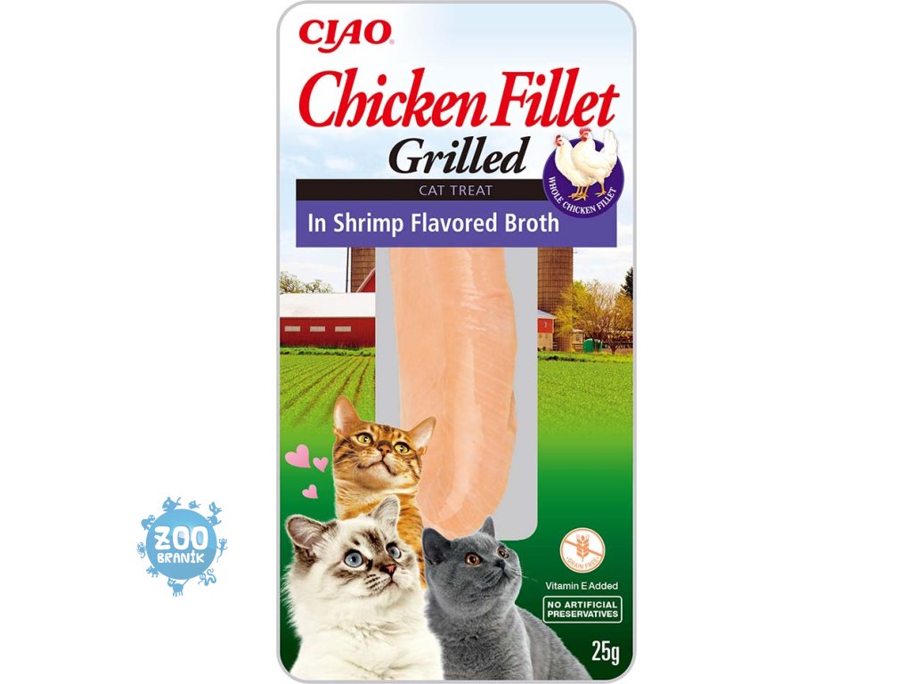 100% kuřecí filátko v poctivém krevetovém vývaru. Šťavnatý grilovaný filet z farmářského kuřete pro gurmánský zážitek. Neodolatelná chuť a vůně poctivého masa. Křehké filátko potěší vaší kočičku jako pamlsek nebo jako doplněk běžné krmné dávky. Lahodný vývar skvěle ochutí jakékoliv granule a pomůže zvýšit chuť k jídlu. Nízký obsah kalorií. Bez obilovin, bez obsahu umělých barviv, bez chemických dochucovadel a bez aromat. Kočičí grain free pochoutka Chicken Fillet je navíc obohacena o 100% přírodní extrakt ze zeleného čaje.