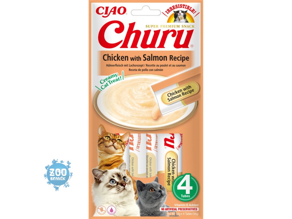 Churu masové pyré pro kočky s kuřecím z farmy a lososem. Lahodný, přírodní pamlsek krémové konzistence bez obilovin. Zdravé mlsání s nízkým obsahem kalorií, bez konzervantů, chemických aromat, bez barviv a umělých dochucovadel. Masové pyré můžete také podávat stejně jako jinou kočičí kapsičku přímo z misky nebo ho můžete přidat ke granulím pro vylepšení jejich chuti.