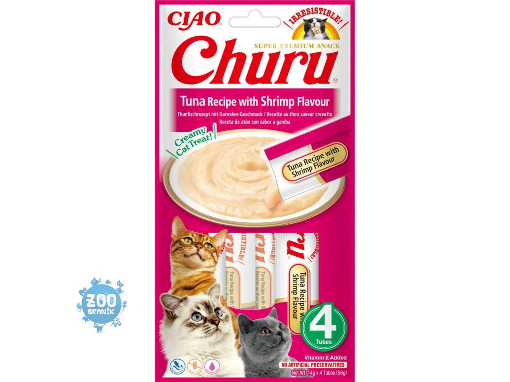 Churu masové pyré pro kočky s tuňákem a s příchutí krevet. Lahodný, přírodní pamlsek krémové konzistence bez obilovin. Zdravé mlsání s nízkým obsahem kalorií, bez konzervantů, chemických aromat, bez barviv a umělých dochucovadel. Masové pyré můžete také podávat stejně jako jinou kočičí kapsičku přímo z misky nebo ho můžete přidat ke granulím pro vylepšení jejich chuti.