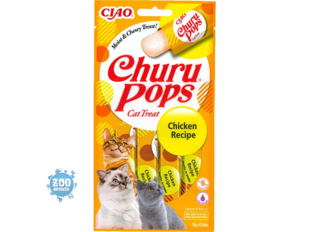 Churu Pops pro kočky s kuřecím z farmářského chovu. Lahodný, přírodní pamlsek krémové konzistence bez obilovin. Zdravé mlsání s nízkým obsahem kalorií, bez konzervantů, chemických aromat, bez barviv a umělých dochucovadel. Díky možnosti podávat extra chutnou grain free masovou pochoutku na způsob kočičí kapsičky přímo z ruky objevíte nový způsob odměňování.