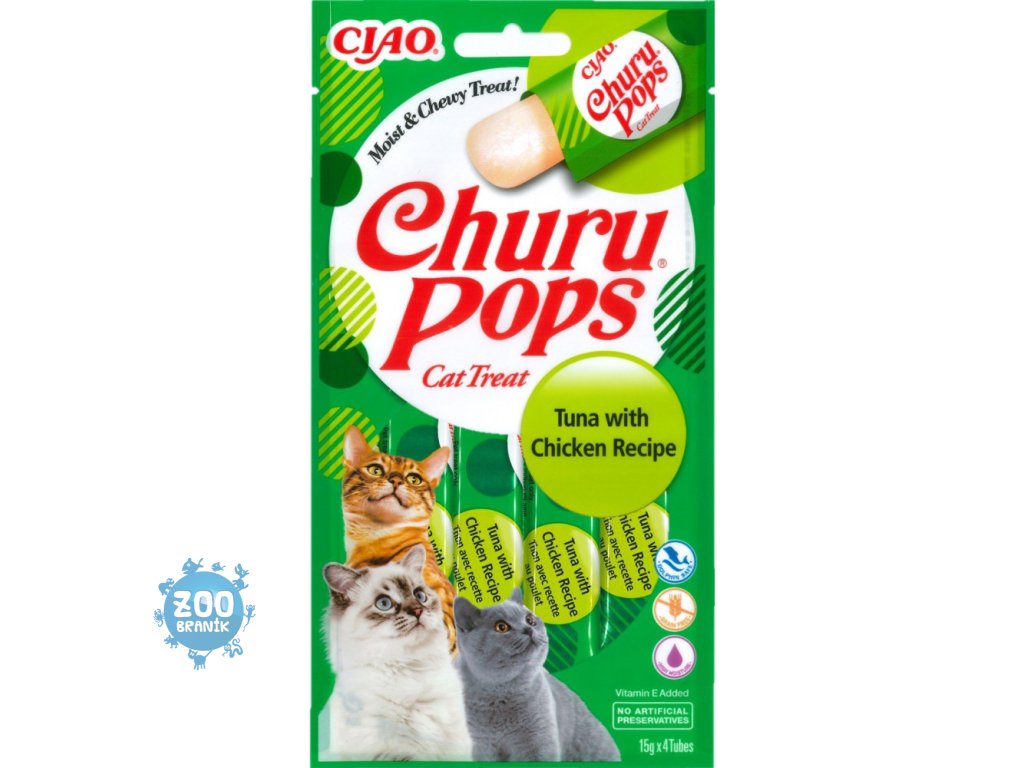 Churu Pops pro kočky s kuřecím z farmářského chovu a divokým mořským tuňákem. Lahodný, přírodní pamlsek krémové konzistence bez obilovin. Zdravé mlsání s nízkým obsahem kalorií, bez konzervantů, chemických aromat, bez barviv a umělých dochucovadel. Díky možnosti podávat extra chutnou grain free masovou pochoutku na způsob kočičí kapsičky přímo z ruky objevíte nový způsob odměňování.