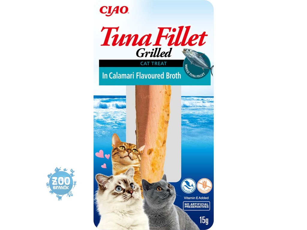 100% tuňákové filátko v poctivém kalamárovém vývaru. Šťavnatý grilovaný filet z divokého tuňáka pro pravý gurmánský zážitek. Neodolatelná chuť a vůně poctivého masa. Křehké filátko potěší vaší kočičku jako pamlsek nebo jako doplněk běžné krmné dávky. Lahodný vývar skvěle ochutí jakékoliv granule a pomůže zvýšit chuť k jídlu. Nízký obsah kalorií. Bez obilovin, bez obsahu umělých barviv, bez chemických dochucovadel a bez aromat. Kočičí grain free pochoutka Tuna Fillet je navíc obohacena o 100% přírodní extrakt ze zeleného čaje.