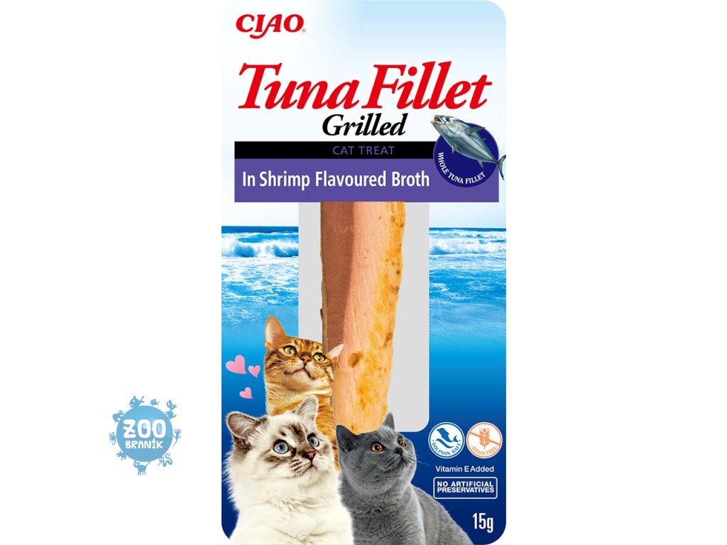 100% tuňákové filátko v poctivém krevetovém vývaru. Šťavnatý grilovaný filet z divokého tuňáka pro pravý gurmánský zážitek. Neodolatelná chuť a vůně poctivého masa. Křehké filátko potěší vaší kočičku jako pamlsek nebo jako doplněk běžné krmné dávky. Lahodný vývar skvěle ochutí jakékoliv granule a pomůže zvýšit chuť k jídlu. Nízký obsah kalorií. Bez obilovin, bez obsahu umělých barviv, bez chemických dochucovadel a bez aromat. Kočičí grain free pochoutka Tuna Fillet je navíc obohacena o 100% přírodní extrakt ze zeleného čaje.