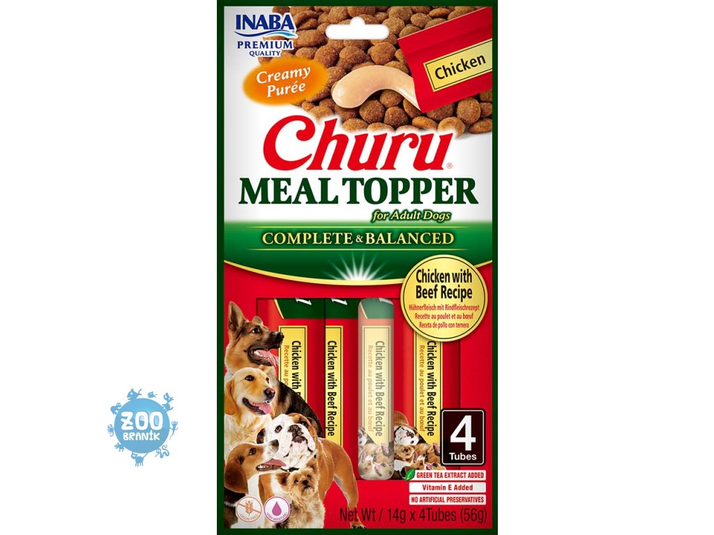 Psy už obyčejné suché krmivo nebaví? Zpestřete jim stravu krémovým Churu Meal Topperem s kuřetem a hovězím, který budou milovat. Churu Meal Topper je kompletní a vyvážené krmivo pro dospělé psy vyrobené ze surovin odpovídající lidské kvalitě. Churu Meal Topper je vyroben z farmově chovaných kuřat a neobsahuje obiloviny, konzervační látky ani umělá barviva. Má vysoký obsah vody, což přispívá k celkovému zdraví psů. Navíc je obohacen o taurin, extrakt ze zeleného čaje, vitamíny a minerály. S Churu Meal Topperem bude krmení chutnější a zábavnější než doposud.