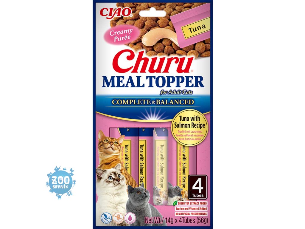 Kočky už obyčejné suché krmivo nebaví? Zpestřete jim stravu krémovým Churu Meal Topperem s tuňákem a lososem, který budou milovat. Churu Meal Topper je kompletní a vyvážené krmivo pro dospělé kočky vyrobené ze surovin odpovídající lidské kvalitě. Churu Meal Topper je vyroben z tuňáka a neobsahuje obiloviny, konzervační látky ani umělá barviva. Má vysoký obsah vody, což přispívá k celkovému zdraví koček. Navíc je obohacen o taurin, extrakt ze zeleného čaje, vitamíny a minerály. S Churu Meal Topperem bude krmení chutnější a zábavnější než doposud.