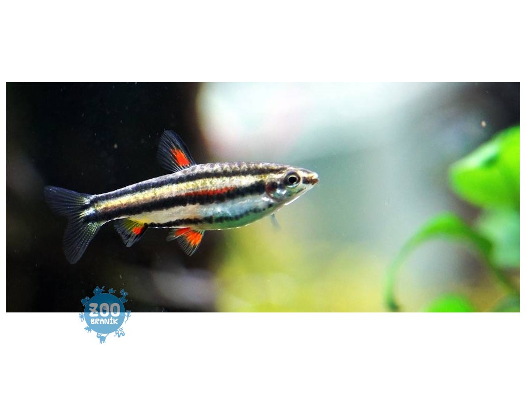 Zbarvení: Stříbřité tělo s dvěma výraznými černými pruhy a červenými akcenty na ploutvích.