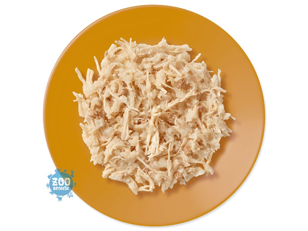 Maso a živočišné produkty (kuřecí prsa 55%, kuřecí játra 7%), rostlinná želatinová složka 1%.