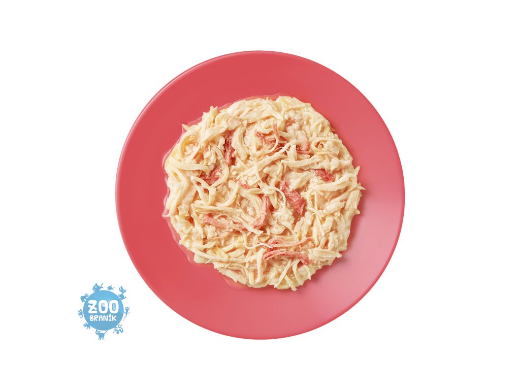 Složení: 70% kuřecí prsa, kuřecí vývar, 5% kachna, rýže.