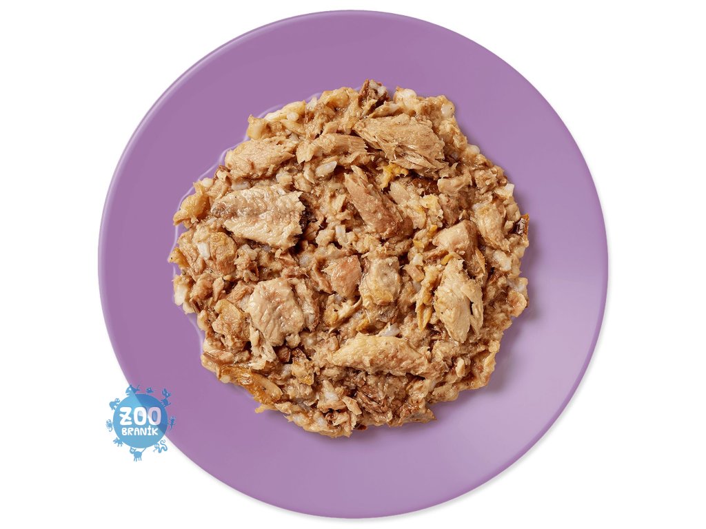 Ryby a výrobky z ryb (makrela 70%, sardinky 5%), rybí vývar 24%, rýže 1%.