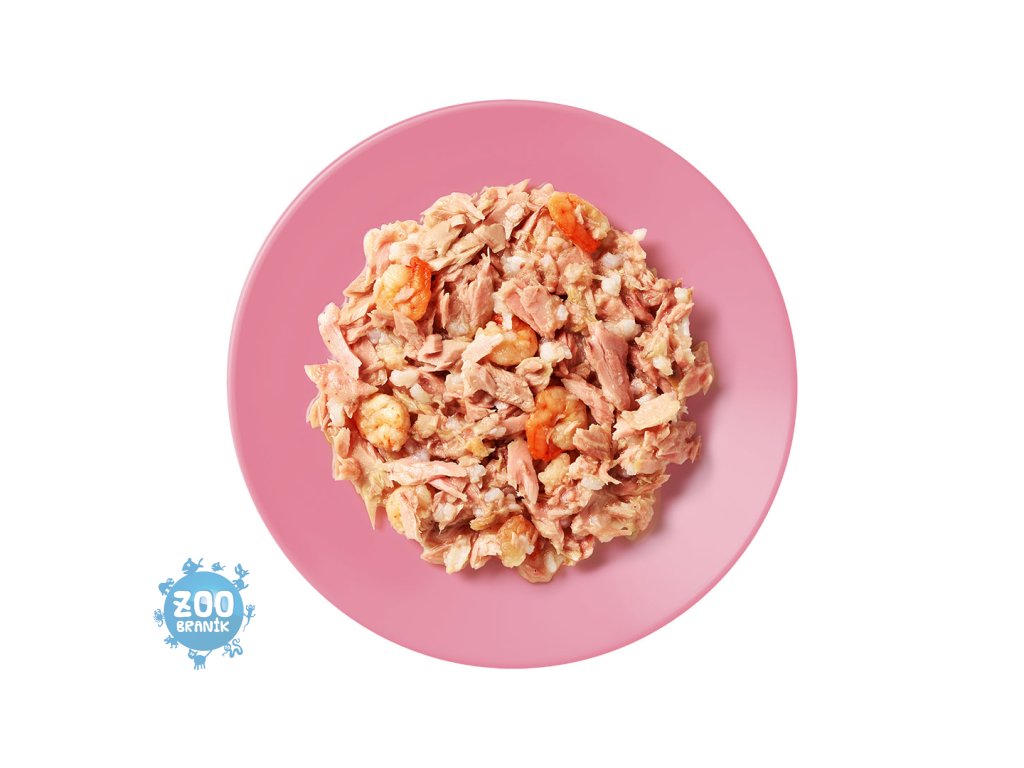Složení: 55% tuňák filet, rybí vývar, 20% krevety, rýže.