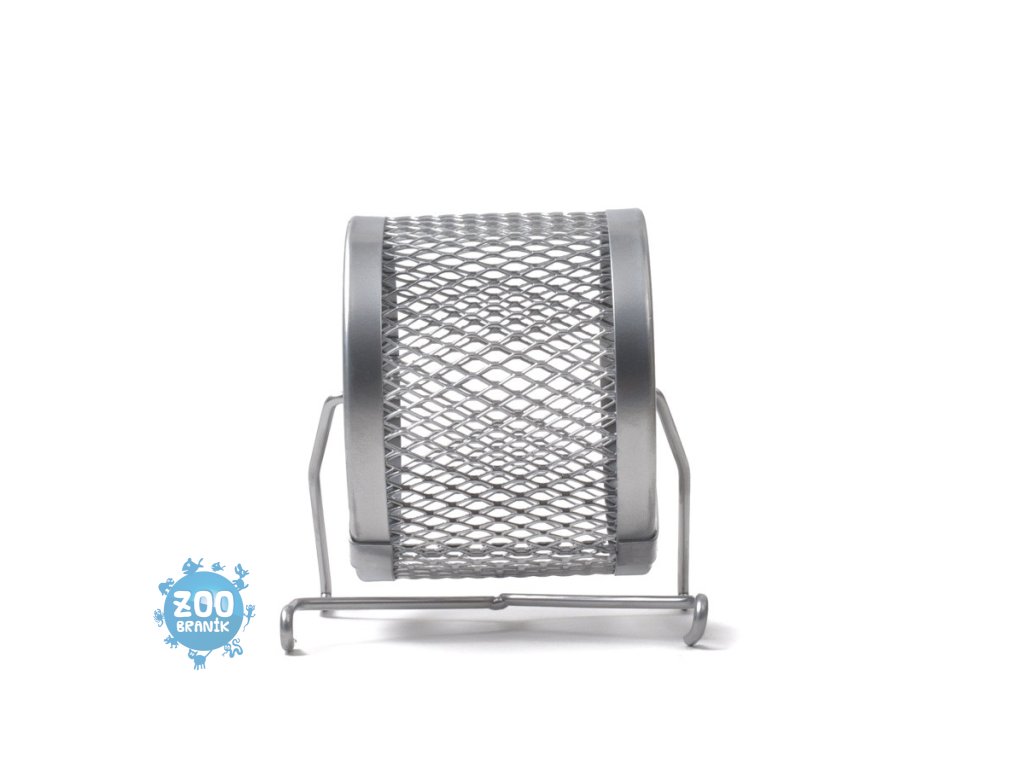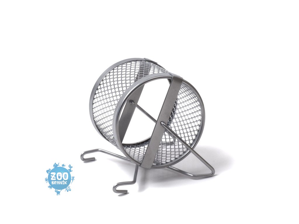 Kovový kolotoč pro hlodavce chromového vzhledu, jehož obvod je tvořen sítem, zažene Vašemu