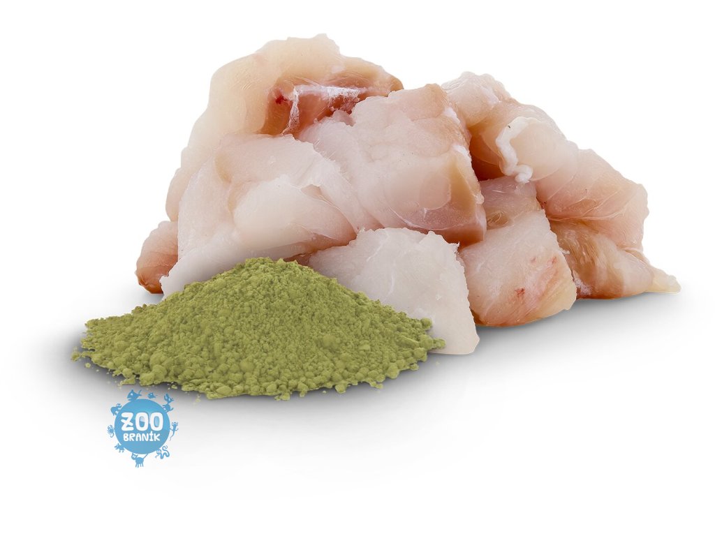 Složení: maso a vedlejší výrobky živočišného původu (kousky masa 73,4 %, z toho kuřecí maso 14 %), ryby a vedlejší výrobky z ryb (z toho kousky tresky 14,6 %), minerální látky, hrachový škrob, hrachová bílkovina, lignocelulóza, čekankový inulin 0,4 %, 0,05 % spirulina