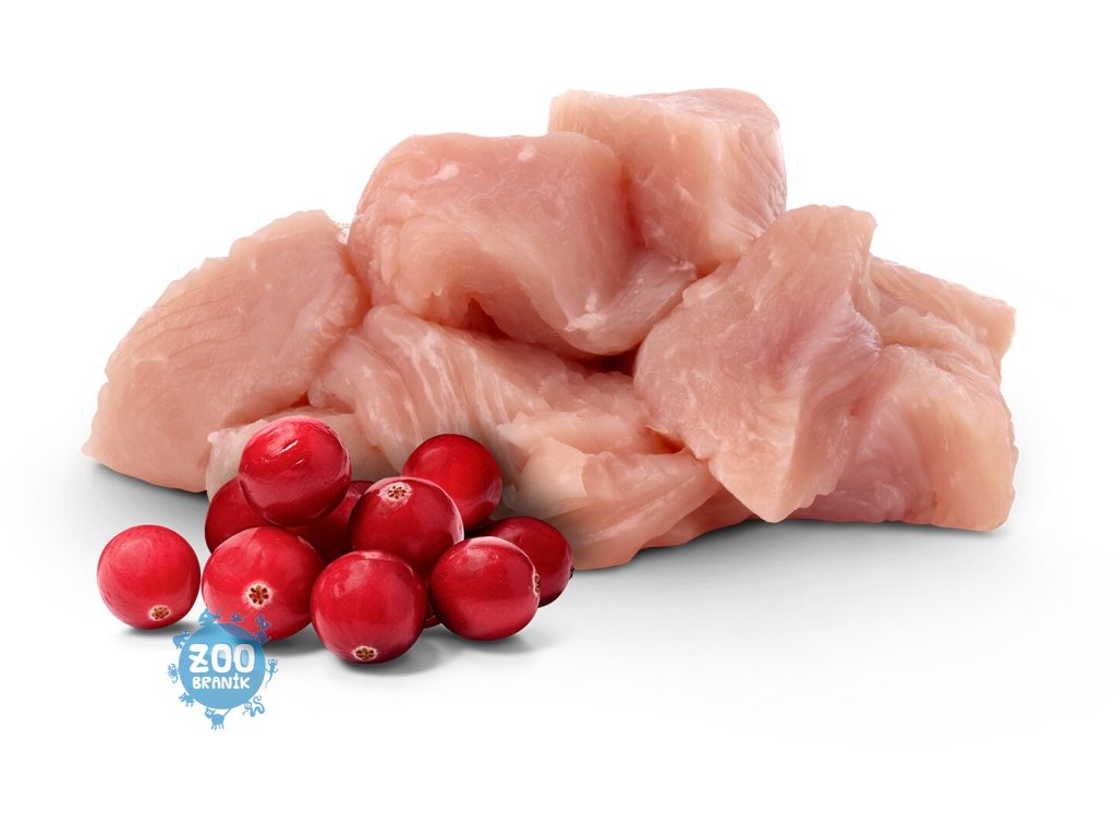 Složení: maso a vedlejší výrobky živočišného původu (kousky masa 88 %, z toho krůtí maso 40,6 %), minerální látky, lososový olej 1 %, hrachový škrob, hrachová bílkovina, čekankový inulin 0,4 %, lignocelulóza, sušené brusinky 0,1 %