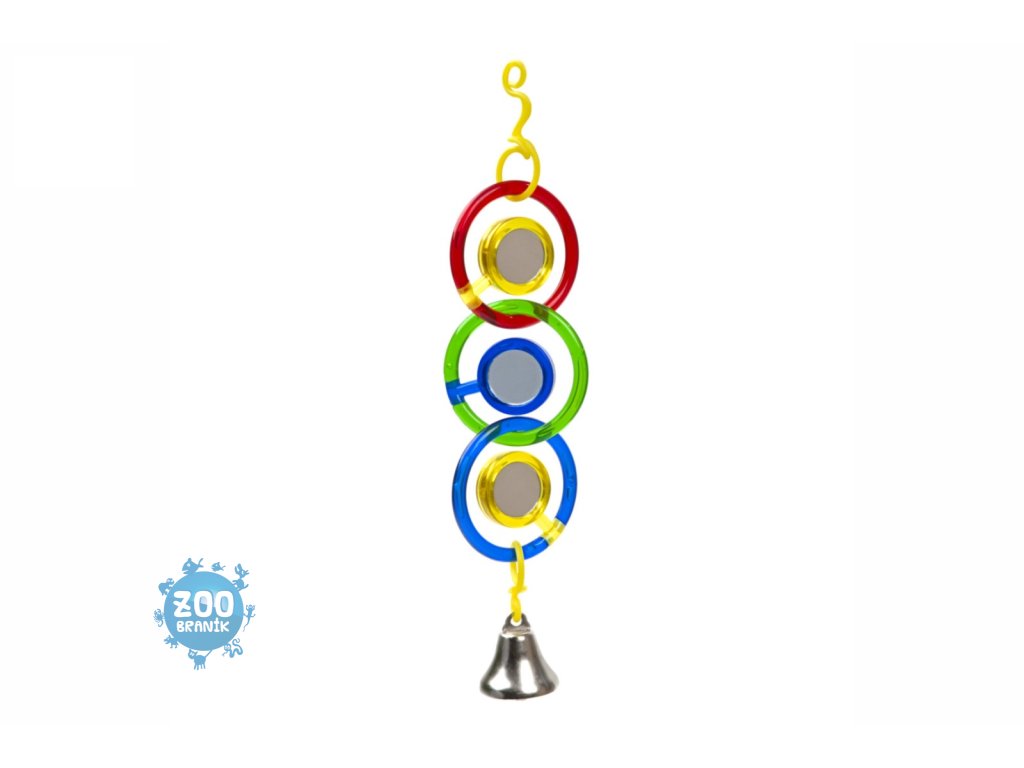 Plastová hračka pro ptáky se zrcátky a zvonkem. Pestrobarevná hračka se zavěšuje do klece. Barvy, odlesky od zrcátek a zvonek vytvoří vašmu ptáčkovi v kleci skvělou zábavu.