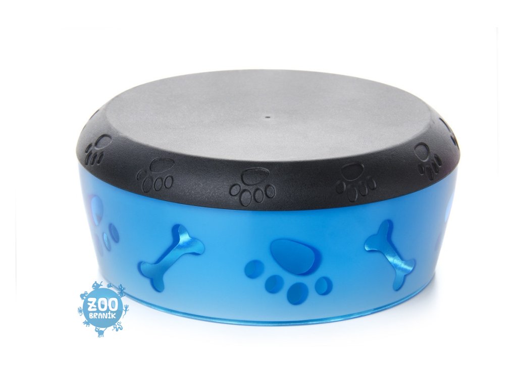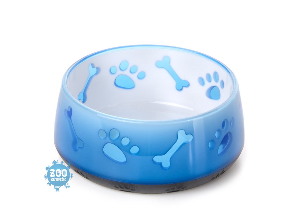 Barevná plastová miska pro psy modro-bílá, malá, 300 ml, 10,5 cm, s protiskluzovou gumovou spodní částí. Luxusní plastová miska v dvoubarevném provedení pro psa je elegantním doplňkem Vaší stylové domácnosti. Miska je zespodu opatřena gumovým povrchem aby neklouzala po podlaze. Uvnitř misky je bílý plast a zvenčí je průhledný barevný plast s průhledy dovnitř ve tvaru tlapek a kostí.