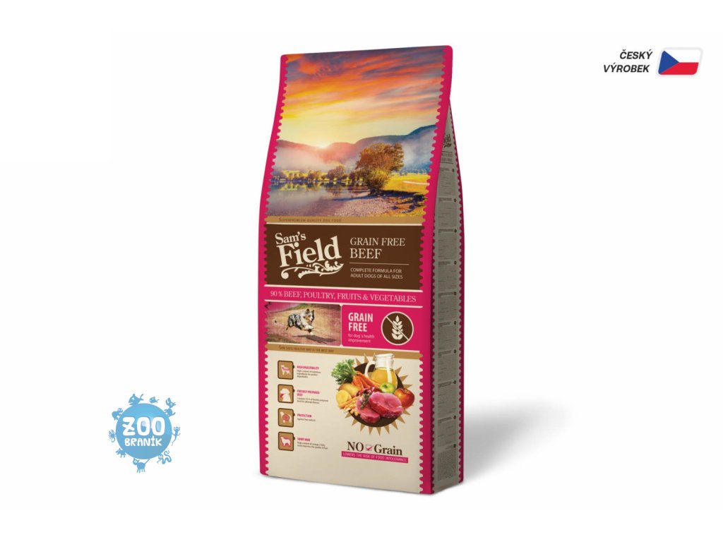 Sam's Field Grain Free Beef (Angus). Super prémiové krmivo s nulovým obsahem obilovin a s vysokým obsahem hovězího masa (Angus) 28 % a kuřecího masa 22 %.