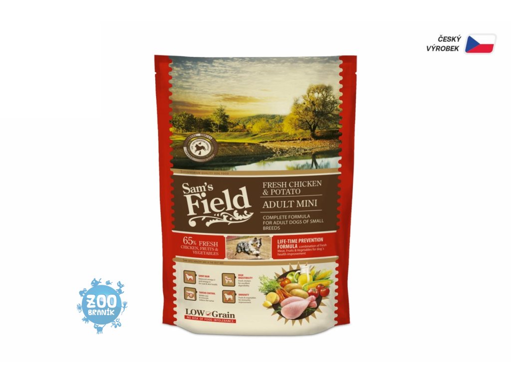Sam's Field Low Grain Adult Mini Chicken & Potato. Superprémiové bezpšeničné krmivo s vysokým obsahem kuřete 31 % a kuřecích jater 12 %.