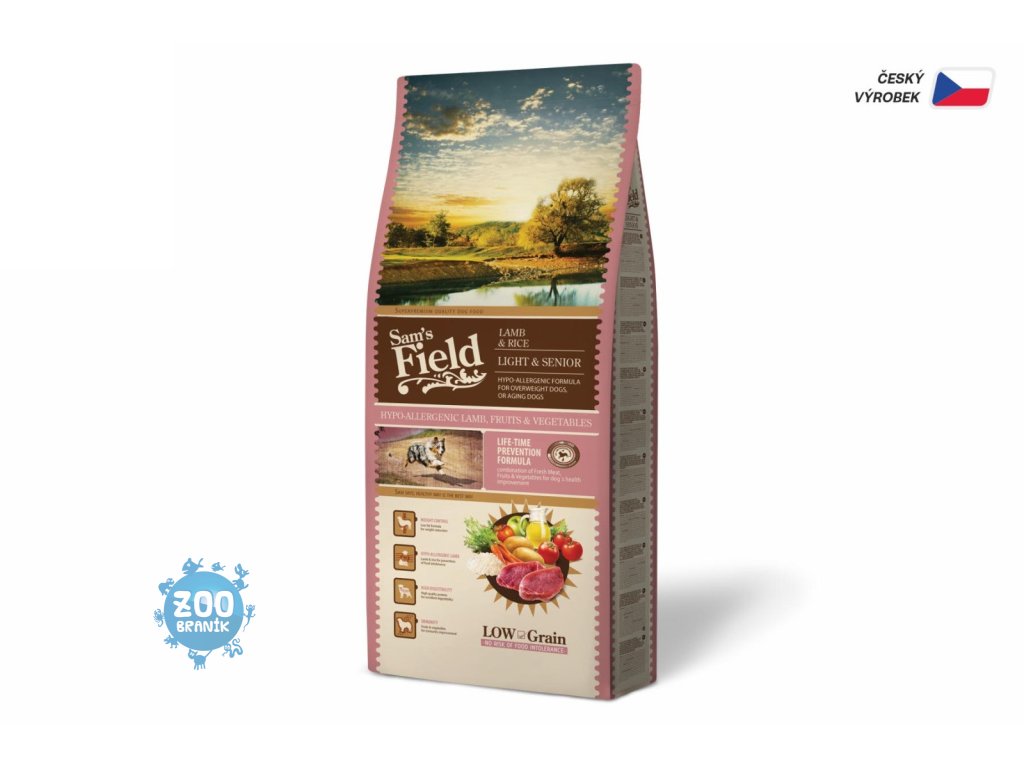 Sam's Field Low Grain Light & Senior Lamb & Rice. Superprémiové hypoalergenní bezpšeničné krmivo s vysokým obsahem jehněčího masa 24 % a rýže 30 %.