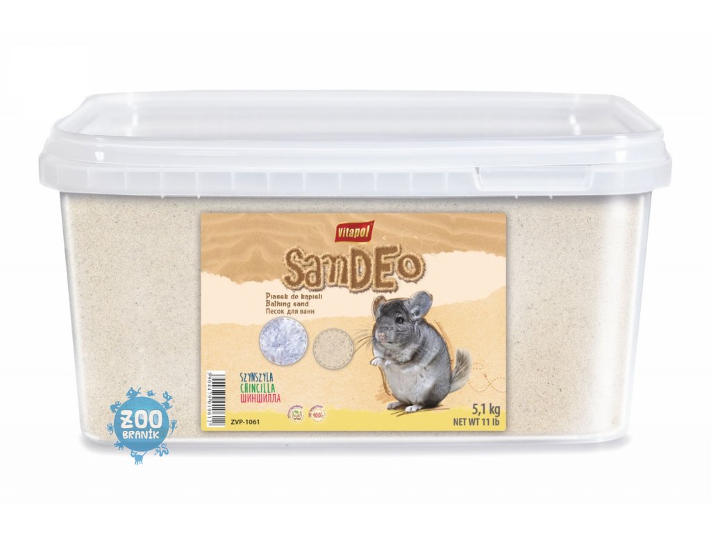 Vitapol písek Sandeo, 5,1 kg. Koupací písek je velmi důležitým prvkem pro chov činčil. Pylová koupel tohoto sympatického zvířátka je z jedné strany zákrokem ošetřujícím a odstraňujícím nečistoty a tuky z kožichu, a z druhé strany také příležitostí k vykonání fyziologických potřeb. Vždy po koupeli je nutno z písku odsát nečistoty a asi po 14 koupelích písek vyměnit. Díky ušlechtilým minerálům, které písek obsahuje, zajistíte svým miláčkům nejlepší podmínky pro dodržování každodenní hygieny.